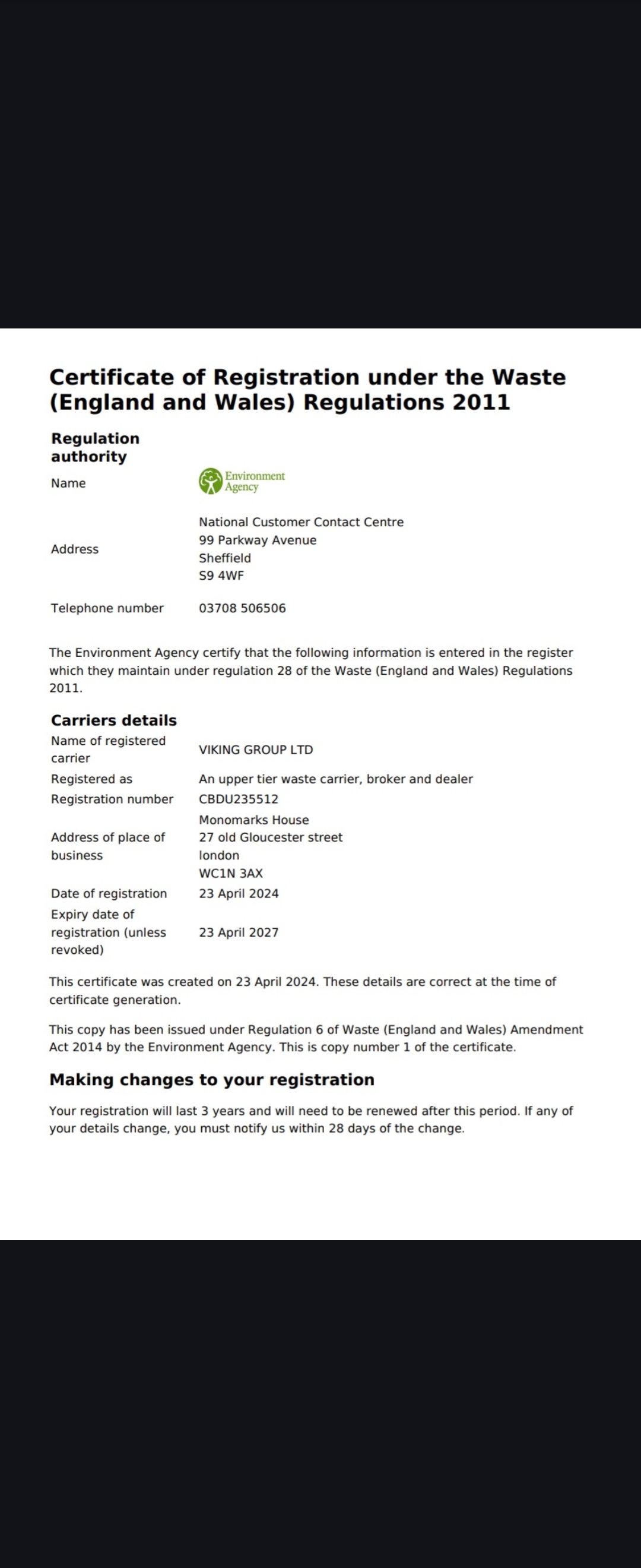 Our waste registration certificate is below, Any vehicles we use to collect waste in Margate, Ramsgate or Canterbury display the Viking Group Ltd logo on